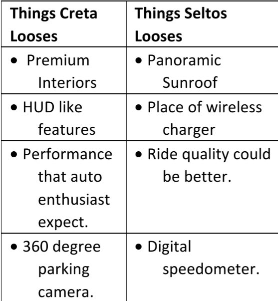 If you’re looking for a car which drives good and more enthusiastically and offers all the features you expect from the car then you should go for Kia Seltos while if you want a car which is good at ride quality and comfort the Hyundai Creta will be a worthy pick for you.